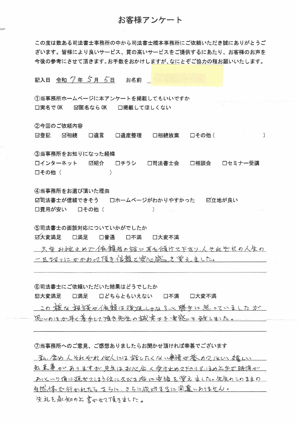 ◆相続登記のお客様 流山市 M様 女性